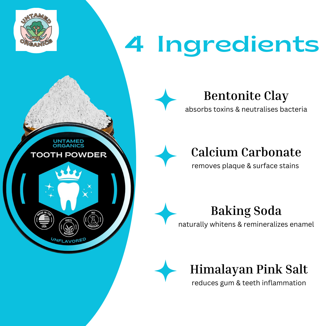 We take great pride in using only four whole, high-quality ingredients in our tooth powder. Sourced from trusted suppliers in the USA, each ingredient is chosen for its purity and effectiveness: